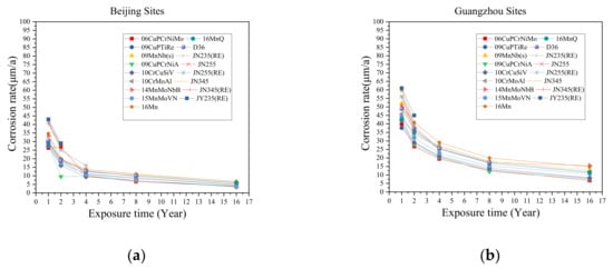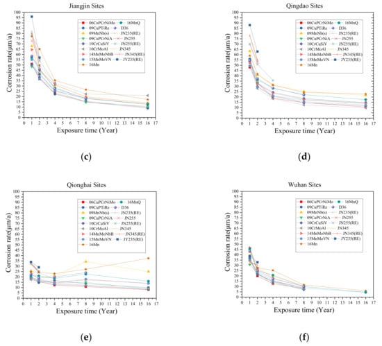Corrosion rates of 17 LAS versus exposure time in different site: (a) Beiing, (b) Guangzhou, (c) Jiangjin, (d) Qingdao, (e) Qionghai, (f) Wuhan.