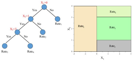 According to Figure 3, assuming that the input is a two-dimensions variable: X1 and X2. If X1 ≤ 0, then the prediction rate is Rate1; if X1 > 0 and X2 ≤ 1, then Rate2; if X1 > 0 and 1 < X2 < 3, then Rate3; if X1 > 0 and X2 ≥ 3, then Rate4.