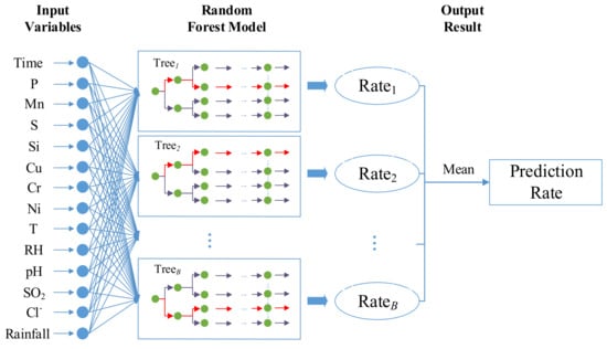 Although CART can implement the purpose of corrosion rate prediction, the individual model may lead to the over-fitting phenomenon. In order to avoid overfitting and improve the generalization ability of the prediction model, a series of CARTs are combined by using bootstrap samples of datasets (i.e., randomly selected subsets of data as training samples for each CART). Meanwhile, a subset of the features is also randomly selected at each branch node of the CART.