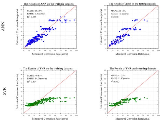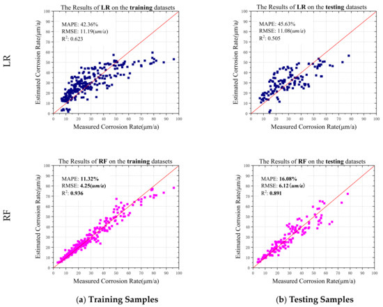 Figure 6 shows the prediction results of ANN, SVR, LR, RF on training and testing samples, and the abscissa coordinates represent the measured corrosion rate. The ordinate coordinates represent the estimated corrosion rate, and the diagonal line is the true-forecast line. The closer the scatter points are to the diagonal line, the better the performance. Firstly, from the results on the training dataset, it can be seen that the training error of the RF is the lowest, and the MAPE, RMSE, and R2 are 11.32%, 4.25 (μm/a) and 0.936, respectively. From the testing datasets, the generalization performance of RF is also best, and the MAPE, RMSE, R2 are 16.08%, 6.12 (μm/a), 0.891. Therefore, RF can obtain better results compared with the other three algorithms.