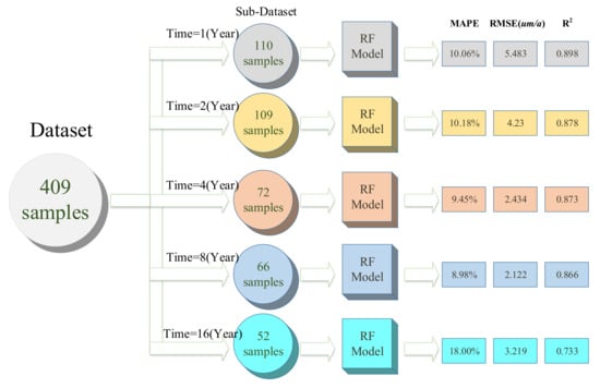 According to the corrosion knowledge, the whole atmospheric corrosion process can be divided into two stages: The initial stage and stationary stage [32]. The former refers to the early stage of corrosion. During this period, the electrochemical reaction of LAS and the effects of the surrounding environmental factors appear to be fierce, the corrosion productions grow faster, and the corresponding corrosion rate is larger. In the stationary stage, the generation of the corrosion productions becomes slow at this time, and corrosion rate tends to be constant. At different stages, the importance ranks of the variables may change. For exploring the different contributions of multiple variables in different exposure time, the paper built 5 different RF models based on 5 sub-datasets, of which each sub-dataset hosts the same exposure time (1, 2, 4, 8, 16 years). The processes and modeling results are shown in Figure 7.