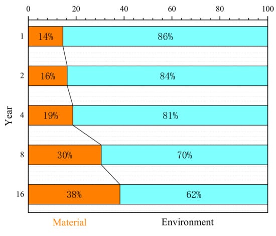 We divided the corrosion process into two stages by the experience which showed that the corrosion of LAS would become stable in about 6–8 years for less corrosive environments or 4–6 years in more corrosive environments [32]. In the paper, we set the split time between the two stages at the 5th year. This means that if the exposure time is less than 5 years, it belongs to the initial stage, and if the time is more than 5 years, it is the stationary stage. Figure 8 revealed that at the initial stage, the environment plays a significant role in the corrosion, and the contributions are always larger than 80%. With the exposure time increasing, the corrosion production is also increased, and these products would hinder the following electrochemical reaction between the environment and the material. However, with different materials and environments, the corresponding corrosion products show different properties. At the initial stage, the products generated on the surface of the material are insufficient to form a protective layer. At this time, the main effect on corrosion is the environmental factors, as shown in Figure 8 (1, 2, 4 years). By the time of the stationary stage, there would be enough products to shield the LAS from environments and to inhibit further corrosion [33]. This kind of difference caused by corrosion products would lead to a great difference in the corrosion protection performance of the layer [1,32,33]. Therefore, the material itself can exert much more influence on corrosion during the stationary stage than that in the initial stage, as shown in Figure 8.