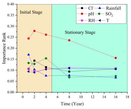Based on the proposed RF model as shown in Figure 7, the paper gives the importance change information of each environmental factor on the corrosion vs. time dimension, and the results are shown in Figure 9.