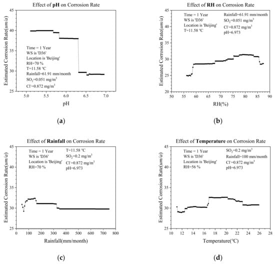 - As for the temperature effect on corrosion, Figure 10d illustrated that when temperature values range from 11–17 °C, the higher temperature could promote the corrosion, and the largest corrosion rate happens when the temperature is in ranges from 17–20 °C; afterwards, the corrosion rate would decrease, though the temperature still increases. For this case, the explanation is that when the temperature in Beijing was higher than 20 °C, there existed a severe evaporation process. Therefore, on the surface of LAS, it is harder to form the electrolyte film, which is a necessity for corrosion.
