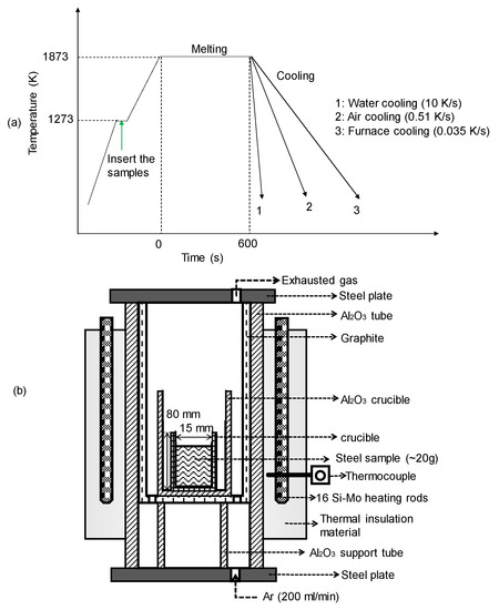 X80 pipeline steel was used in this study, the composition of which is shown in Table 1. The production procedure of X80 pipeline steel is “basic oxygen furnace (BOF)→ladle furnace (LF) refining→RH refining→Ca treatment→soft-blowing→continuous casting”. Molten steel specimens were taken from the ladle furnace after the Ca treatment and soft-blowing for 600 s, and quenched into water immediately. Figure 1a shows a schematic of the thermal history for re-melting and cooling treatments of the specimens used in this study. The specimens were first re-melted at 1873 K for 600 s in a Si-Mo resistance furnace under an argon atmosphere in MgO crucibles, as schematically shown in Figure 1b. After that, the crucibles were taken out and cooled at three different cooling rates by employing water, air or furnace, respectively, as schematically shown in Figure 1a.
