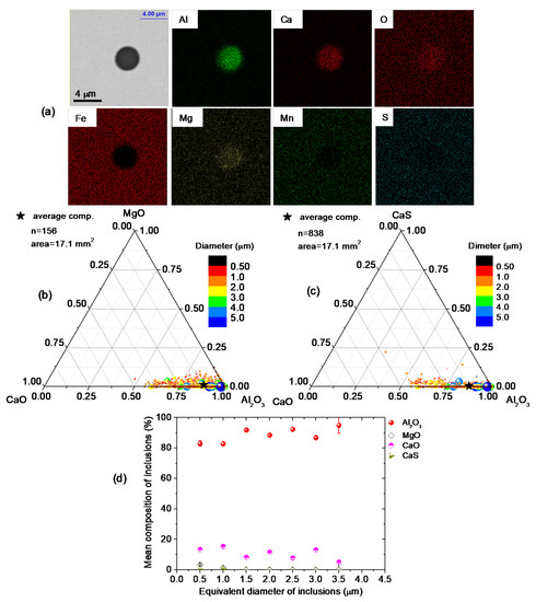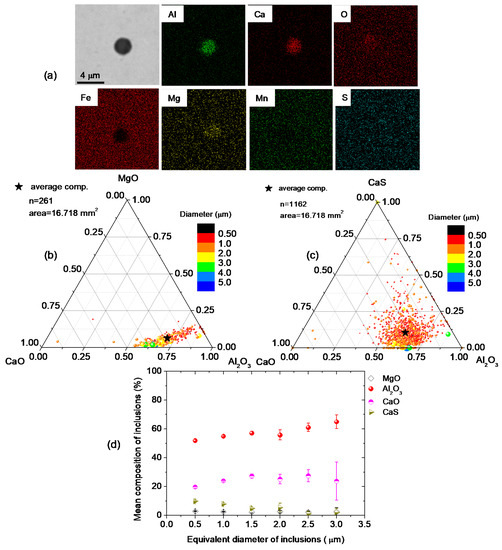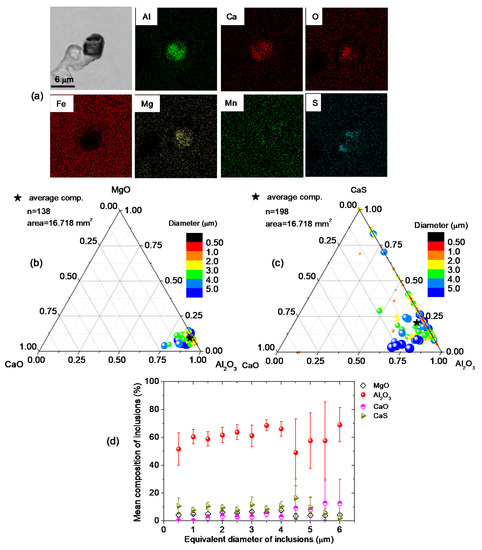 Figure 4d shows the variation in composition of inclusions against its diameter. The content of Al2O3 increases with the increase in diameter of the inclusions up to 4 μm, then it has a large fluctuation with the further increase in diameter. The content of CaO is slightly increased in the inclusions larger than 4 μm. The contents of CaS and MgO do not show strong dependence on the size of the inclusions.