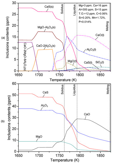In order to understand the effects of cooling rate on the composition of the inclusions, the contents of the various inclusions against the temperature in the pipeline steel was calculated by Fact Sage, which is shown in Figure 6a. The steel was melted at 1873 K as indicated in by a broken line in the phase diagram, at which all the inclusions were in liquid phase. With the decrease in temperature, the amount of liquid inclusions including CaO(l) and Al2O3(l) is increased at first and then it is decreased. During the solidification, the liquid inclusions gradually disappeared, and the solid inclusions including CaS, MgO-Al2O3 spinels and CaO-2Al2O3 are formed. The calculated average composition of the inclusions against the temperature obtained by combining the contents of each phase is shown in Figure 6b.