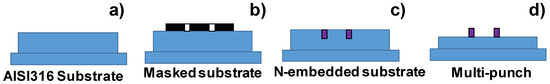 Plasma printing procedure in the present study. (a) The starting AISI316 substrate, (b) masked substrate by the screen printing, (c) nitrogen-embedded substrate by plasma nitriding, and (d) multi-punch formed by the blasting.