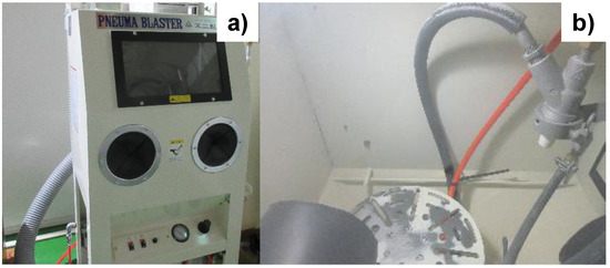 Mechanical blasting equipment. (a) Overall image of blasting equipment and (b) the shooting stage of substrates in manual operation.