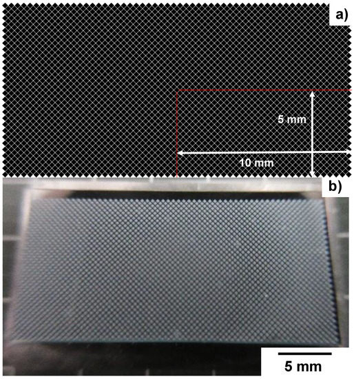 The screen was prepared to have a micro-meshing pattern with the spatial resolution of 0.2 μm as depicted in Figure 5a. The square cell units of 200 μm × 200 μm were directly printed onto the AISI316 die surface. Figure 5b shows the screen-printed micro-pattern onto the die surface. The square cell units were printed in white by using the TiO2-based ink to form the micro-meshing pattern with the line width of 50 μm and the pitch of 250 μm. Their deviation in width and pitch was within ±0.3 μm in practice.
