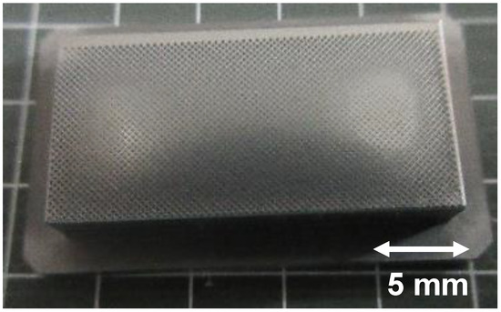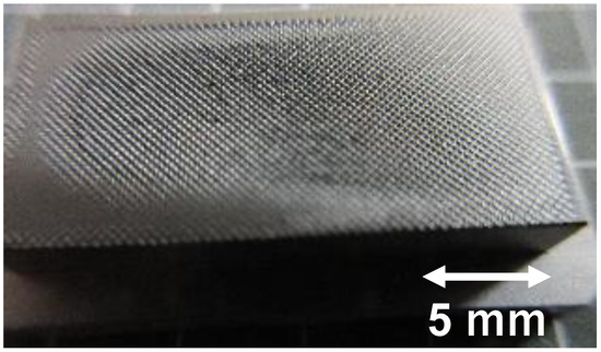 Figure 6 depicts the plasma nitrided AISI316 die substrate after cleansing the masking inks. The unprinted micro-meshing lines in Figure 5b were selectively plasma nitrided to form the micro-meshing network with nitrogen super-saturated microstructure on the whole substrate surface. After References [11,12,14], the nitrided layer thickness after nitriding by the same conditions reached to 60 μm on average. Average surface hardness was measured to be 1200 HV with the standard deviation of hardness within only 30 HV.