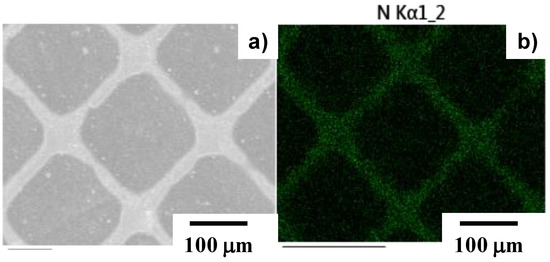 Scanning electric microscopy as well as EDX were utilized to analyze the microstructure of the nitrided AISI316 die surface and to map nitrogen across the square cell units. As shown in Figure 7a, the micro-meshed lines were regularly aligned by the pitch of 250 μm. These lines also had higher nitrogen content than 5 mass% selectively in their widths, as analyzed in Figure 7b. Although the residuals of masking inks were left as a thin film, no height difference was seen between the masked and nitrided areas on the surface.