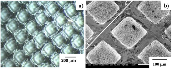 The blasting process was employed to remove the printed parts from the nitrided AISI316 die substrate in Figure 6 and Figure 7. Figure 8 depicts the blasted die surface. The whole surface became a multi-punch head with meshing line network. Figure 9 shows its optical microscopic image and SEM image where a square micro-cavity with a size of 180 μm × 180 μm and a depth of 75 μm was formed in regular alignment. In particular, the SEM image in a narrow range in Figure 9b proves that the un-nitrided square cells in Figure 7 were selectively dug in depth by this sand blasting to form the micro-meshed punch head array with the line width of 70 μm.