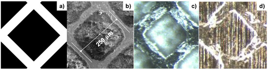 A two-dimensional micropattern on the screen was transcribed into three-dimensional micro-textures on the copper plate by the present plasma printing. The micro-meshing pattern on the screen corresponds to the CAD data in Figure 11a; the white square unit cell with the edge length of 200 μm was directly printed onto the AISI316 die surface. There was little error in dimension at this step of the screen printing. Figure 11b shows the square unit cell on the nitrided AISI316 substrate at 673 K for 14.4 ks after cleansing the surface. Although thin TiO2 ink residuals overlapped at the vicinity of the mask edges and corners, the un-nitrided unit cell geometry was preserved to be a square in Figure 11b. Let us compare the unit cell geometries before and after sand blasting in Figure 11b,c. In correspondence to the original square pattern in Figure 11a, the square micro-cavities, each with an edge length of 180 μm and a depth of 75 μm, were shaped into the AISI316 die. The four edges and corners of each micro-cavity had sufficient sharpness to be working as a micro-embossing punch.