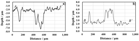 The surface roughness on the punch array heads influenced the dimensional accuracy of the meshed copper substrate cavities. A three-dimensional profilometer was employed to measure the surface roughness profile along the line A–A’ in Figure 9b. As shown in Figure 12a, Ra of the meshed punch head surface was 1 μm except for the crossed line-heads where deep dimples were seen heterogeneously. This punch head roughness reflects on the micro-cavity quality of the copper products. Figure 12b shows the surface roughness along the line B–B’ in Figure 10b on the micro-cavities, which were cut into the copper substrate by micro-embossing. Three convex bumps were seen in correspondence to the roughness along the line A–A’ in Figure 12a. Since the dimensional deviation between two surface profiles in Figure 12 was less than 1 μm, the original surface profile on the arrayed punch heads was accurately transcribed onto the copper substrate by the present micro-embossing with use of a multi-punch array.