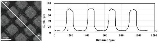 A three-dimensional profilometer was also employed to measure the surface geometry of the multi-punch array. Figure 13 shows the surface geometry across four micro-punches along the line C–C’. The average height and pitch of micro-punches were 75.7 μm and 251 μm, respectively. The deviation of height was +1 μm and −2 μm among the four micro-punches. This deviation was corresponding to the surface roughness on the punch head. Each micro-punch in Figure 13 had dull shoulder edges; the borders between masked and unmasked zones might have had a lower hardness than the nitrided zone at the center of the punch head. The average head height was higher by 15 μm than the previous data of 60 μm in Reference [4]. This might be because AISI316 has a softer matrix hardness of 200 HV than the martensitic stainless steel AISI420 in Reference [4].