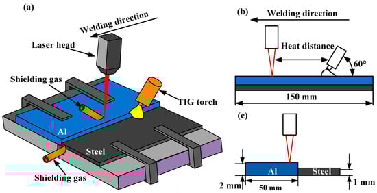 Schematic diagram of the arc-assisted laser welding; (a) overview, (b) front view, and (c) side view.