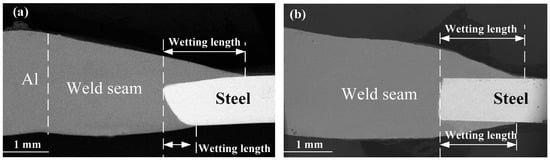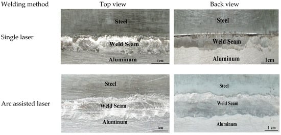 In the welding brazing process, the wetting and spreading behavior of Al molten pool on the steel surface determined the formation of weld seam []. In the present study, the weld seam morphology was mainly evaluated based on its continuity and back formation. Figure 3 shows the morphologies of top and back surfaces of the welding seams formed by single laser and arc assisted laser welding processes, respectively. Both the two methods can get continuous front formation of the weld seam, however, the back formation of arc assisted laser method exhibited a better wetting and spreading morphology than single laser welding brazing. This result suggests that assisted arc improves the wettability and fluidity of Al molten pool and helps the Al molten pool spread to the back surface of the steel plate.