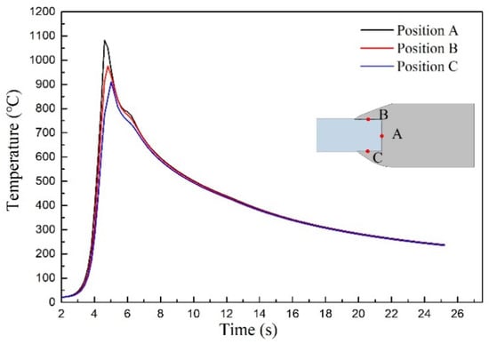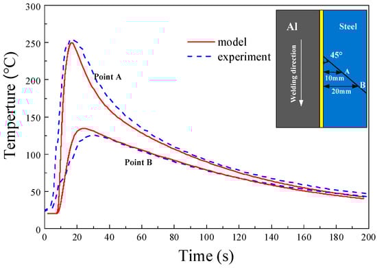 To understand the wetting and spreading behavior of motel pool, a FEM model of temperature field was established. Figure 5 displays the thermal cycles of point A and point B on the top surface of the steel, the thermal profiles calculated by the FEM at different positions were in good agreement with the experimentally measured values.