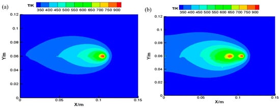 Figure 6 shows the temperature field of molten pool (X-Y plane) in the single laser and arc assisted laser welding process. As can be seen from Figure 6, the temperature field distribution of the molten pool under the action of a single laser and arc assisted laser is similar to the double ellipse distribution. The temperature distributions on both sides of aluminum/steel were asymmetric. As shown in Figure 6b, due to the addition of the assisted arc, the temperature field distribution of the base metal surface becomes larger than that in the single laser process, and the maximum temperature of the molten pool reaches 1002.54 K. The heat input from the arc can increase the spreading time of the molten metal in the welding pool, thus forming a better joint. Adding arc in the laser welding helps enhances the heat conduction, which allows the molten metal to have enough time to wet on the surfaces of the workpiece and to solidify in a little longer time.