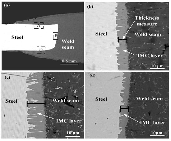 It is known that the structure and thickness of IMC layers play important roles in determining the mechanical behavior of welding joints []. A typical cross-section of weld joint was selected to observe the IMC layer. The specimen was obtained using the following process parameters: laser power of 1200 W, welding speed of 10 mm/s, heat distance of 15 mm, and arc current of 15 A.