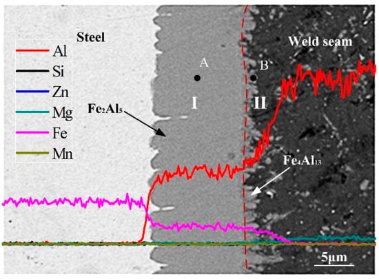 In order to identify the phase compositions of the IMC layer, an EDS line scanning analyses of the IMC layer was performed, as shown in Figure 9. It is evident that both Fe and Al uniformly distributed in the corresponding regions, i.e., the steel and the Al alloy, as expected, since no IMC can be observed in the steel matrix, and there are only a small amounts of IMC randomly distributed in the welding seam. According to the EDS pattern of the line scan, the IMC layer can be divided into two layers of I and II. In the layer I, both the fractions of Al and Fe remain relatively unchanged with the change of the distance to the steel/IMC interface. In the layer II, the fraction of Fe decreases with the decrease of the distance to the interface between the IMC layer and the welding seam, while the fraction of Al increases with the decrease of the distance to the IMC/weld seam interface. Such behavior suggests that the IMC in the layer I has different structure with that in the layer II. It is worth pointing out that there are little amounts of other elements presented in the IMC layers. The EDS point analysis of the IMCs was performed for the positions A and B as labeled in Figure 9, the atomic ratio of Al to Fe is in the range of 65/27 (~5:2) to 77/22 (~3:1), which suggests the formation of Fe2Al5 and Fe4Al13 IMC.