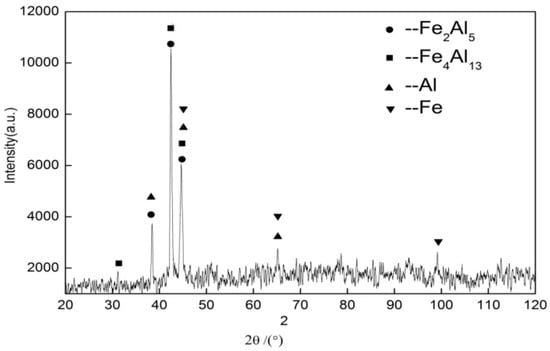 The XRD analysis results of fracture plane in steel side, as shown in Figure 10. The XRD results show that the reaction layer included two different kinds IMC: Fe4Al13 and Fe2Al5. According to Fe-Al equilibrium phase diagram [], six non-stoichiometric IMC of Fe3Al, FeAl, FeAl2, Fe2Al3, Fe2Al5, and Fe4Al13 possibly form during reaction between iron and aluminum. Previous studies about the welding of aluminum alloy to steel indicated that the formed compound near welded seam was intermetallic compounds FeAl3 phase [,]. Van et al. [] state that the η phase has two term name of “Fe4Al13” and “FeAl3”, while Fe4Al13 is more accurate expression. The IMC layer can be divided into two sublayers, as above analysis; one consists of Fe2Al5 IMC, and the other consists of Fe4Al13 IMC. The interface between the Fe2Al5 phase and the steel is presented in the needle-like shape, and the interface between the Fe4Al13 phase and the Al alloy is presented in the flocculent-like shape.