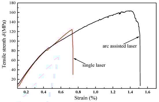 To compare the mechanical property between single laser welding and arc assisted laser welding, tensile tests of the tensile specimens were performed. Figure 12 shows the engineering stress-strain curves for the welded joint prepared by using single laser and arc assisted laser in the same welding parameters. The tensile strength value of the weld joint obtained by arc-assisted laser welding brazing was about 1.3 times than that in single laser welding brazing process. The highest value was near to 163 MPa, which almost 5A06 aluminum alloy strength for 74% (Under the same test conditions, the tensile strength of 5A06 aluminum alloy is 219 MPa), it indicates that the addition of arc can improve the tensile strength of aluminum/steel butt joint.