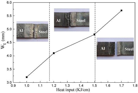 here Wt is the total wetting width, Wb is the wetting width of back formation, and the Wf is the wetting width of front formation. Figure 13 shows the typical failure modes of joint that was obtained in different welding heat input for arc assisted laser welding. The total wetting width increase with the heat input increase. When the heat input was lower, the specimen was failure at the wetting and spreading zone due to the poor wetting ability of the weld pool. The highest tensile strength was 163 MPa when the weld joint failure at the weld seam. The worst case of tensile properties was fractured along the aluminum/steel interface with average tensile strength of 98 MPa when the total heat input exceeds 1.5 KJ/cm. In this case, the total width was about 5.7 mm, however, duo to the heat input was higher, the thickness of IMC exceeded permissible value (about 10 μm) [] and the mechanical properties become worse. Note that a smooth edge morphology of fracture joint was appeared when the heat input exceeds 1.5 KJ/cm, it can be attributed to a brittle fracture caused by IMC layer. To improve the tensile strength of welded joints, one needs to limit the thickness of IMC.