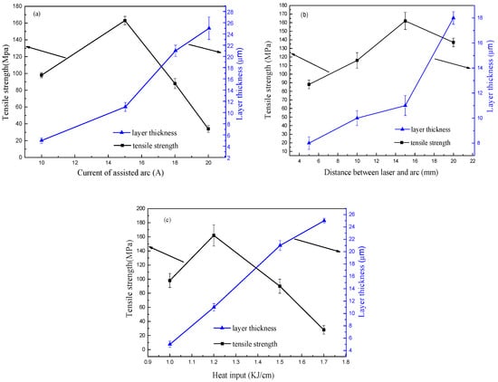 As discussed in introduction part, the IMC layer plays an important role in determining the structural durability of the structures consisting of welded joints. To examine the effect of the IMC layer (welded joints) on the Al/steel weld joint, tensile tests of the tensile specimens were performed. As the tensile strength and IMC were mainly affected by the heat source, we selected three main parameters (laser heat input, assisted arc current, and heat source distance) as variables. The tensile strength of the joint and the thickness of the IMC were measured under the same welding parameters. As shown in Figure 14, the thickness of the IMC increases linearly with the increase of the process parameters, while the tensile strength reaches certain value and then drops rapidly. This implied that due to the high heat input, the excessive growth of IMC layer led to the poor tensile strength of the joint. Therefore, in order to improve the strength of joint, it should control the heat input. The maximum tensile strength can reach 163 MPa When the IMC thickness between 8 μm and 12 μm. Tensile strength decreased rapidly when the thickness of the compound was more than 13 μm. Comparing Figure 14a,c to Figure 14b, Figure 14b had a more slowly decreasing trend in the process of tensile strength reduction. It indicates that the appropriate heat distance between laser and arc can improve tensile strength due to good weld appearance.
