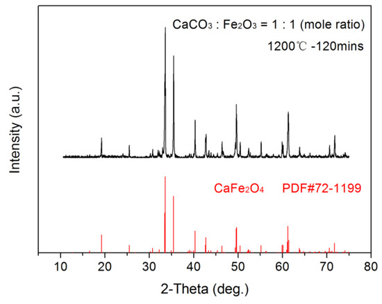 All of the analytical reagents (chemical purity > 99.5%) used in this study, including calcium carbonate (CaCO3), ferric oxide (Fe2O3), silicon dioxide (SiO2) and aluminum oxide (Al2O3), were purchased from an e-commerce supplier. After being fully dried in a drying oven for 6 h at 80 °C and sifted through a 200 mesh sieve (75 μm), sufficient quantities of CaCO3 and Fe2O3 were weighed to obtain a mole ratio of 1:1 using an electronic scale. Then, they were stirred together clockwise with a glass rod for 30 min and thoroughly blended in an agate crucible for 2 h. Next, moderate deionized water was added to the raw materials and acted as an adhesive. A cylindrical mold was filled with 10 g of this powder and compression molding proceeded with a briquetting machine at a holding pressure of 5 MPa for 1 min. The cake-shaped samples (approximately 9 mm in height and 22 mm in diameter) were fully dried in a drying oven for 12 h at 80 °C and prepared for sintering. Groups of five samples were placed in a 100 cm2 corundum crucible, as shown in Figure 1a, and sintered in a high-temperature box furnace in air according to the sintering schedule. As shown in Figure 1b, the temperature in the furnace rose from ambient temperature to 1200 °C at a rate of 5 °C/min, during which the temperature remained constant for 30 min periods at 200 °C, 400 °C and 800 °C. Then the samples were slowly cooled down to ambient temperature in the furnace after being sintered for 120 min at 1200 °C in the furnace. Thus, the CF samples were synthesized for the subsequent research.