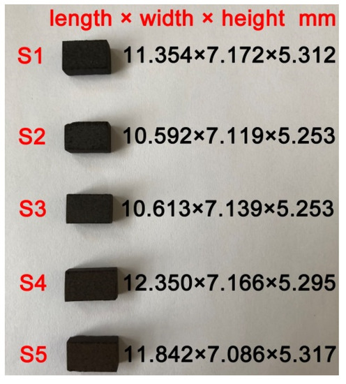 The linear expansion coefficients (LECs) of samples S1–S5 from 30 to 400 °C were measured with the NETZSCH DIL 402SE made by the NETZSCH Group of Germany (Selb, Germany). The samples S1–S5 were prepared as described in Section 2.1.2 in a strip-shaped mold for the test, as shown in Figure 3. After one of the samples was fixed in the chamber, the following parameters should be input to the machine: the number of sample, the length of sample, the range of temperature, and the heating rate. The rest of the parameters remained at their default. Then the thermal expansion instrument was started to obtain the LEC of each sample from 30 to 400 °C.