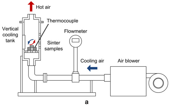 (V) Vertical tank cooling: as shown in Figure 4, a homemade vertical tank cooling device was designed to simulate a semi-industrial experiment with a vertical tank cooling process for the iron ore sinter. The surface temperatures of samples S1–S5 first dropped to 600 °C in the sealed vertical tank. Then, they were processed with forced air at 10 m3/h in 1 atm and 20 °C. The blower was stopped when the samples cooled down to 150 °C, after which they were removed from the tank and cooled down to the ambient temperature in the atmosphere.