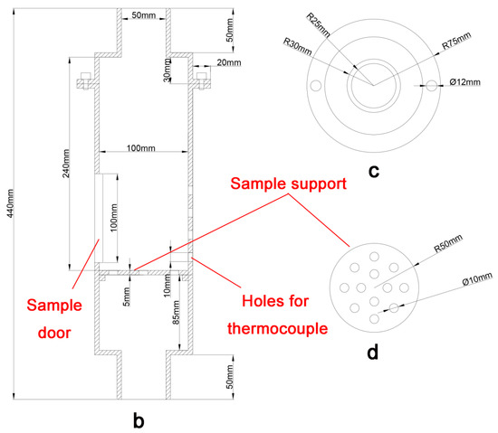 (II) Cooling in forced air: after 800 °C, samples S1–S5 were moved into a vertical tank and cooled with forced air at 30 m3/h in 1 atm and 20 °C using a homemade cooling device, which consisted of a blower, flowmeter, and vertical tank, as shown in Figure 4. To minimize the heat loss, the door of the tank was shut and sealed immediately after the samples were placed on a porous grate in the tank. Here, a thermocouple was used for the real-time monitoring of the surface temperatures of the samples, and the samples were removed after being cooled down to the ambient temperature.