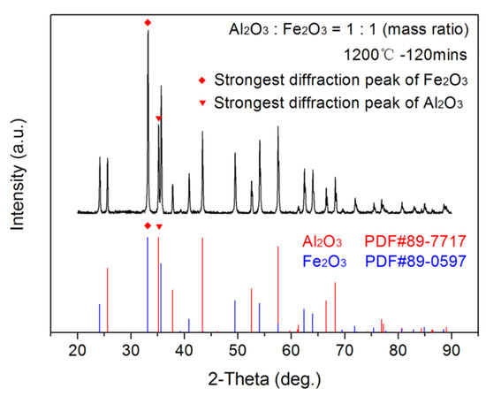 The XRD pattern of the mixture consisting of Fe2O3 and α-Al2O3 with a mass ratio of 1:1 is shown in Figure 5. The ratio of the strongest peak intensity of Fe2O3 to that of α-Al2O3 suggests that the K-value mentioned in Section 2.2 is 2.24.