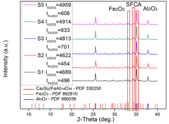 The XRD patterns of samples S1–S5, mixed with equivalent known quantities of α-Al2O3, are shown in Figure 6. The relative peak intensities of Fe2O3 and α-Al2O3 were measured with the software MDI Jade version 6.1 developed by the Materials Data, Inc. (Livermore, CA, USA) [17]. Therefore, the mass ratios of the SFCA in samples S1–S5, averaging two repeated test results, are listed in Table 3, and the relationship between the n(Al2O3)/n(Fe2O3) value and the mass ratios are shown in Figure 7. As can be seen, there was a maximum of 91.23% and minimum of 86.70% in S2 and S3, respectively, with increases occurring from S1 to S2 and from S3 to S4, and a stable trend occurring for samples S4 and S5.