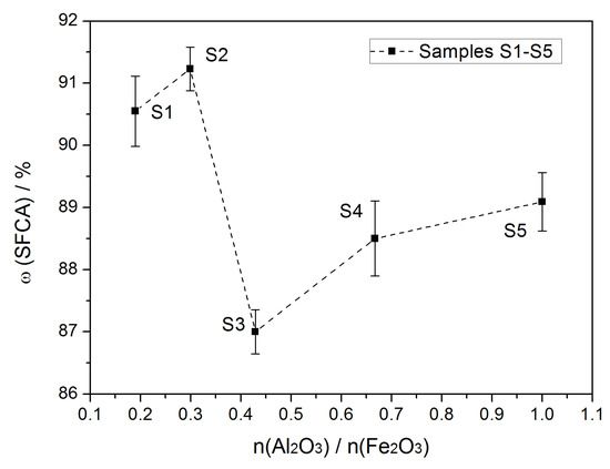 Relationship between the mass fraction of the SFCA and the corresponding n(Al2O3)/n(Fe2O3) value of the samples S1–S5.