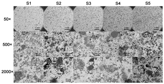 SEM morphologies of samples S1–S5 magnified 50 times, 500 times, and 2000 times.