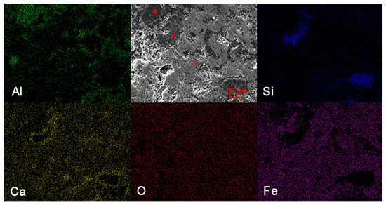 The SFCA morphologies obtained using a scanning electron microscope (SEM) with back scattered electron imaging (BSE) for samples S1–S5 are shown in Figure 8. To obtain the phase compositions of the samples, the SEM morphologies with the corresponding EDS analysis results for the line and map scanning of sample S2 are shown in Figure 9 and Figure 10. The element analysis results for points a, b, and c in Figure 9 are listed in Table 4. The enrichment of the element Ca around the SiO2 contributed to the formation of CaSiO3. The dark gray Al2O3 particles are larger than those of the SiO2, and the gaps between phases are obvious. Further, the grayish white or bright white phases are CF, mixed with a small amount of the incompletely reacted Fe2O3. Generally, SFCA is a kind of solid solution cooled down from high-temperature liquid CF with dissolved Al2O3 and SiO2, which accounts for most of the entire sample.