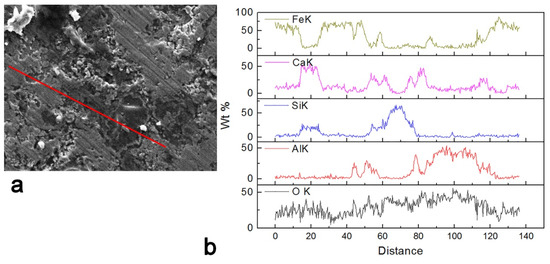 Secondary electron micrograph of sample S2 (a) and corresponding EDS line scanning spectrum (b).