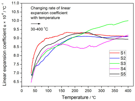 The LECs of samples S1–S5 from 30 to 400 °C are shown in Figure 11. The variation trends of curves S1, S2, and S5 are similar, with the LEC increasing significantly from 30 °C to 200 °C and then stabilizing at 9.0 × 10−6 °C−1 until the end. Curve S3 rises continuously to 400 °C and finally reaches a maximum of 10.0 × 10−6 °C−1. Curve S4 rises significantly from 30 °C to 150 °C and then declines slightly to 225 °C, followed by another rise until the maximum of 9.1 × 10−6 °C−1. Curve S5 ascends to a maximum of 9.25 × 10−6 °C−1 at 250 °C and then drops until the end.