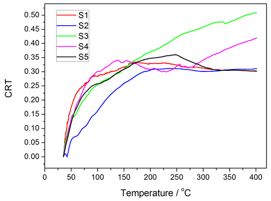 CRT values of samples S1–S5 from 30 to 400 °C.