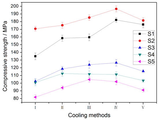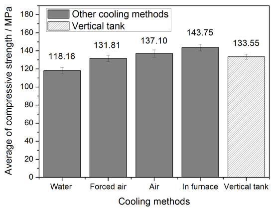 In order to investigate the impact of the vertical tank cooling and other four cooling methods on the quality of the samples, the average compressive strengths with the different cooling methods were obtained. As shown in Figure 16, the average strength after (I) cooling in water is the lowest (only 118.16 MPa); the average strength after (IV) cooling in the furnace is the highest (up to 143.75 MPa); and the average strength after (V) vertical tank cooling is 133.55 MPa, which is between those after (II) cooling in forced air and (III) cooling in air. The results show that (IV) cooling in the furnace has an obvious positive effect on the strength of the samples, followed by (III) cooling in air, with (I) cooling in water leading to the greatest deterioration in the strengths of the samples. Because the vertical tank cooling process consists of (II) and (III), the result of the corresponding average strength is reasonable.