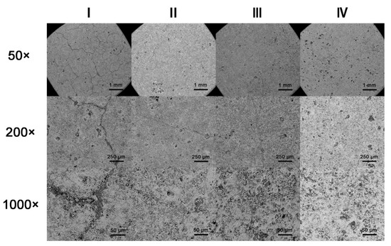 SEM morphologies of S2 magnified 50, 200, and 1000 times after using four different cooling methods: (I) cooling in water, (II) cooling in forced air, (III) cooling in air, and (IV) cooling in furnace.