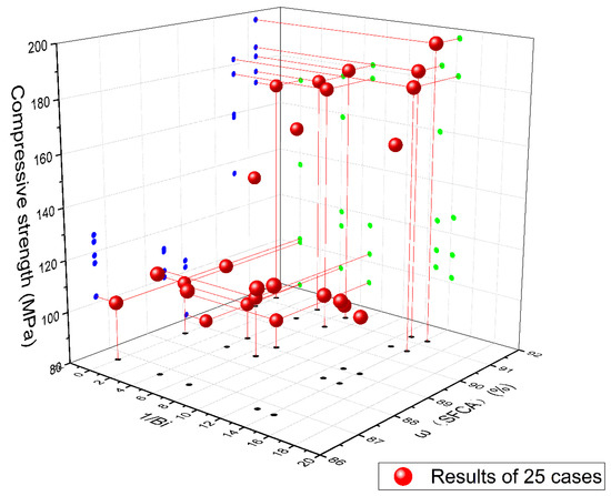 The effect of the SFCA content and Biot number on the compressive strength of the iron ore sinter during the cooling process is shown in Figure 18. As shown in the results, a high (low) strength basically corresponds to a high (low) value for ω(SFCA) or 1/Bi. In particular, the highest strength of 196.56 MPa was obtained with the highest ω(SFCA) (91.23%) and 1/Bi (14.18), which indicated that higher mechanical strengths for iron ore sinters will be obtained with higher SFCA content and lower Biot numbers during the cooling, and this will guide the evaluation of mechanical strength of iron ore sinter after the cooling process in industry.