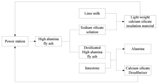 High alumina fly ash (HAFA) is a byproduct of high-temperature combustion of high-alumina coal in thermal power plants. The annual emission of HAFA is approximately 30 million tons []. Except for a small amount that is utilized, most of the HAFA is currently stockpiled in northwestern China, not only occupying farmland, but also giving rise to severe pollution of water, atmosphere, and soil [,]. On the other hand, the high alumina content (approximately 50%) in high alumina fly ash makes it a valuable recycling resource. Furthermore, HAFA contains critical metals such as gallium [], lithium [], and rare earths [,] that can be extracted in the alumina extraction process as byproducts. Many extraction techniques, such as predesilication soda lime sintering [], limestone sintering [], acid leaching [,], ammonium sulfate [] and submolten salt methods [], have been developed to extract alumina from HAFA. Only the predesilication soda lime sintering process was carried out at an industrial scale (200 kt per year) by China Datang Corporation in the province of Inner Mongolia []. This formed a circular economy industry (shown in Figure 1) in Tuoketou County, Inner Mongolia. The recycling route of thermal power plant HAFA is presented in Figure 1.