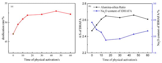 Effect of physical activation time: (a) desilication rate, (b) A/S and Na2O content of IDHAFA.