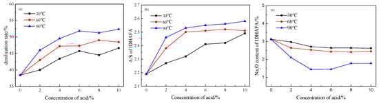 It is observed from Figure 3a that the desilication rate of the HAFA after acid activation is greatly improved compared with the conventional predesilication. The desilication rate is also improved with increasing temperature. The desilication rate is enhanced by more than 50% when the temperature is 90 °C. In addition, an increase in the acid concentration also enhances the desilication rate. It is observed from Figure 3b,c that the variation of the IDHAFA aluminum: silicon ratio is completely consistent with the desilication rate, but the change of the sodium oxide content in the IDHAFA shows a completely opposite trend to that of the desilication rate. This shows that the desilication fly ash aluminum: silicon ratio can reflect the desilication rate, while the sodium oxide content indicates the degree of the side reaction, which is inversely proportional to the desilication rate.
