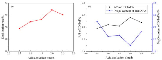 Effect of acid activation time (T = 95 °C): (a) desilication rate, (b) A/S and Na2O of IDHAFA.