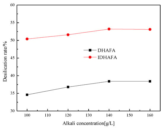Effect of alkali concentration on the desilication rate of IDHAFA and DHAFA (Predesilication conditions: T = 95 °C, L/S = 3.5, and t = 150 min).